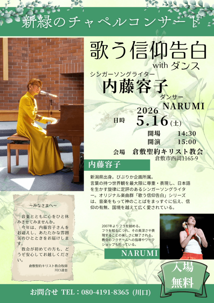 みなさん、お元気ですか? 倉敷教会では、初夏の新緑の季節に、シンガーソングライターの内藤容子さんをお迎えし新緑のチャペルコンサートを開催します。今回は、ダンサーのNarumiさんもご一緒です。楽しみにして来てくださいね。入場無料です。教会の駐車場は60台分を準備しています。